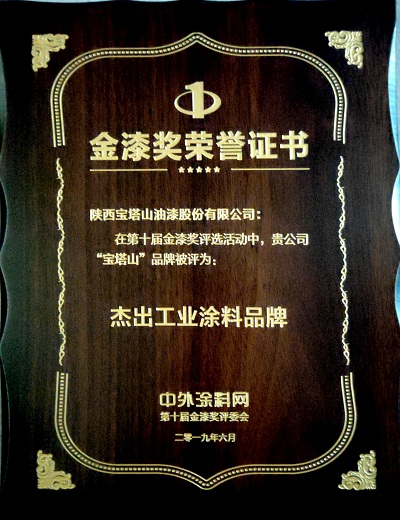 2019年6月,寶塔山漆的“寶塔山”品牌在中外涂料網(wǎng)第十屆金漆獎(jiǎng)評(píng)選活動(dòng)中被評(píng)為“杰出工業(yè)涂料品牌”
